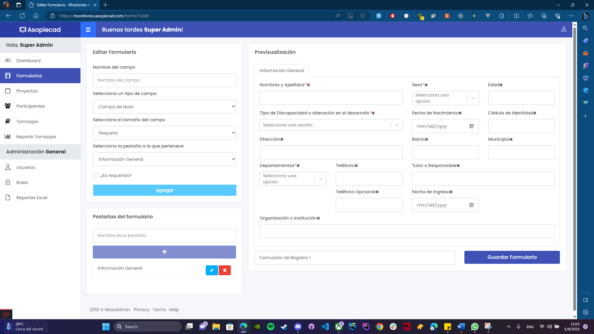 - Formularios Dinámicos: El usuario final puede crear formularios personalizados, los cuáles estan asociados a un proyecto y permiten registrar participantes en estos. Los formularios cuentan con campos de Texto, Fecha, Archivo, etc.
